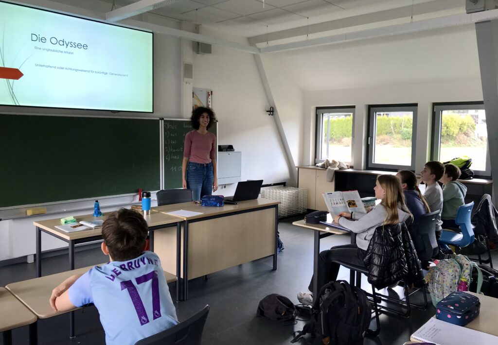 Am Freitag, dem 18.04.2026, erlebte die Klasse G6b eine besondere Geschichtsstunde: Gebannt lauschten die Schülerinnen und Schüler den Abenteuern des Odysseus. Thea Culotta aus der E-Phase hatte im Rahmen des Faches Medienkompetenz eine eindrucksvolle Präsentation zur Odyssee erarbeitet und teilte diese mit den jüngeren Lernenden.